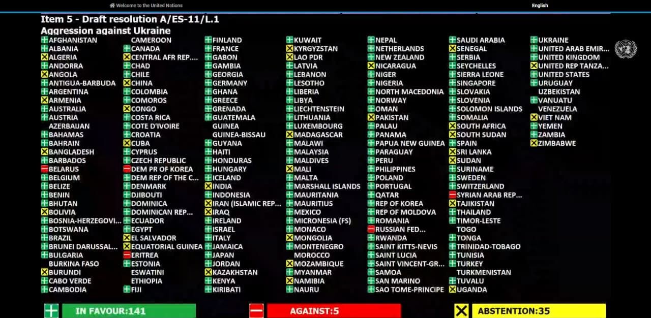 به گزارش ایرنا، ۱۴۱ عضو سازمان ملل با رای مثبت به قطعنامه پیشنهادی حدود ۸۰ کشور، حمله روسیه به اوکراین را محکوم کردند و خواستار خروج فوری نیروهای روسیه از اوکراین شدند.
