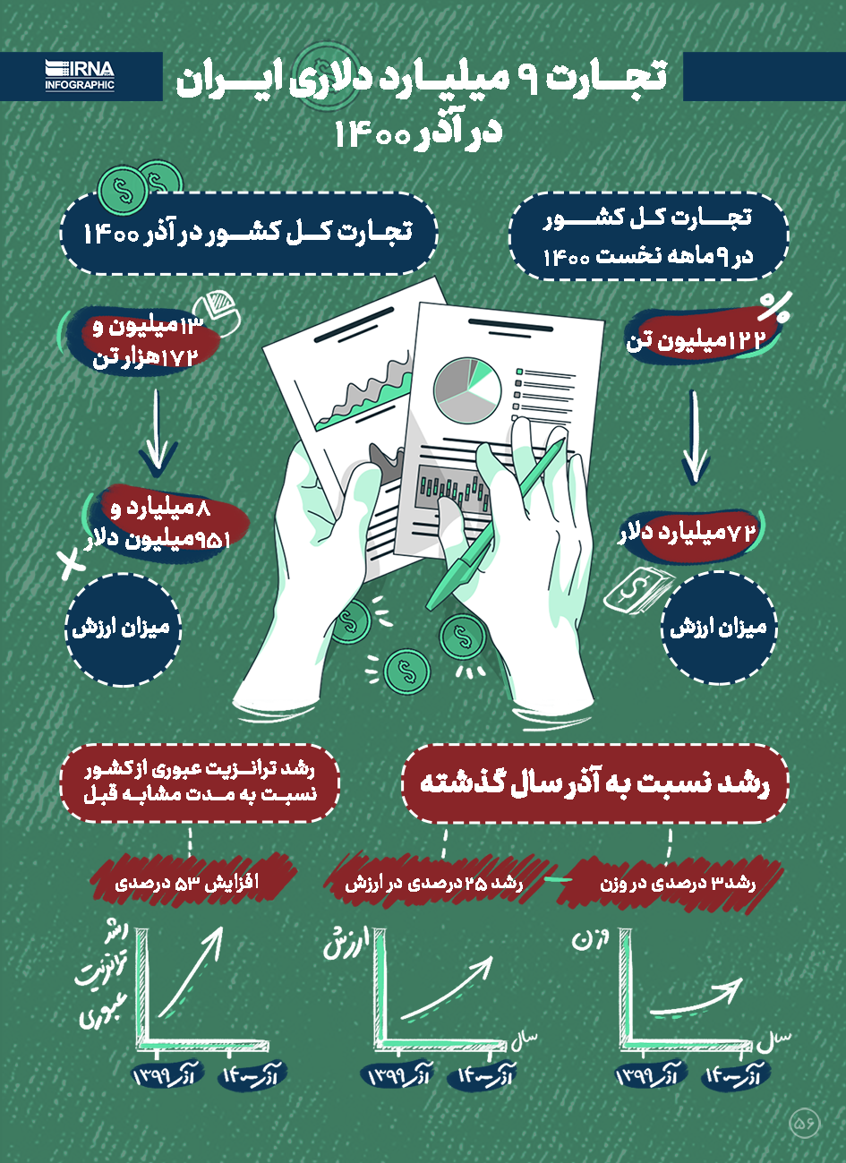 تهران- ایرنا- تجارت کشور در آذر سال جاری به ۱۳ میلیون و ۱۷۲ هزار تن به ارزش هشت میلیارد و ۹۵۱ میلیون دلار رسید که این مهم نسبت به آذر سال پیش، سه درصد در وزن و ۲۵ درصد در ارزش رشد داشته است.
